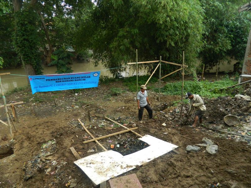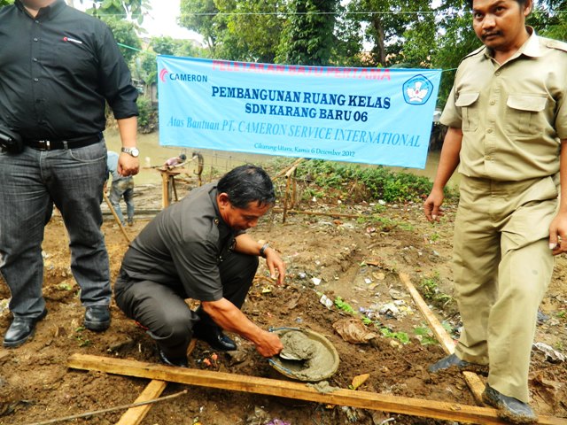 Mendung menggelayut di langit Cikarang ketika saya bersama rombongan PT Cameron Service International (CSI) tiba di SDN Karang Baru 06, Cikarang, Kamis pagi (6/12). Dalam hati sempat terbersit rasa khawatir bila hujan turun dan membuyarkan prosesi acara peletakan batu pertama pembangunan gedung kelas baru di SD tersebut yang merupakan bagian dari program tanggung jawab sosial perusahaan (CSR) PT CSI dan rencananya akan dimulai pukul 10.00 pagi. Kami dari PT CSI yang hadir antara lain Pak Irham Nusaly, Pak Edwin Tedjakusuma, Pak Febrian Kurniadji, Pak Mariono, Ibu Sally, Pak Yamin, dan Pak Ichwan Ridwan.