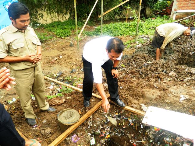 Kami lalu bersama-sama menuju kesana. Diawali oleh Pak Irham yang memberikan “sentuhan” awal berupa semen dan batu pada konstruksi fondasi ruangan kelas baru. Disusul kemudian oleh saya, perwakilan UPTD Cikarang Utara, Kepala Desa Karang Baru dan Kepala Sekolah SDN 06.