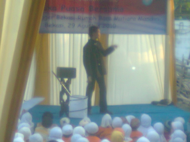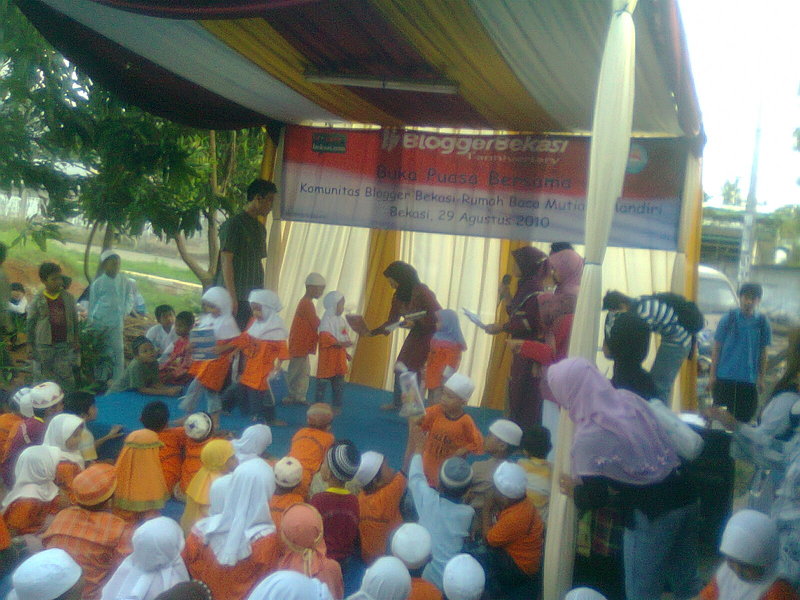 Menjelang buka puasa, Panitia membagikan bingkisan alat-alat tulis kepada anak-anak dhuafa serta santunan kepada anak-anak yatim. Diserahkan pula bantuan Blogger Bekasi kepada Rumah Baca Mutiara Mandiri. Dalam kata sambutannya, Mas Aris menyampaikan, acara yang bertema “Bergembira dan Ceria bersama anak-anak” ini, merupakan salah satu rangkaian kegiatan peringatan HUT pertama Komunitas Blogger Bekasi yang merupakan sebuah upaya konstruktif ikut berbagi kebahagiaan bersama di bulan suci Ramadhan.