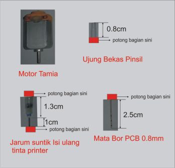 Gara-gara bor pcb ngadat, akirnya saya mencoba membuat sendiri bor pcb ini , dan hasilnya lumanya tidak kalah dengan bor pcb saya rusak..maklum cuma harga 80 ribu… Bor pcb yang saya buat ini hanya mengahabiskan dana Rp. 2500, itu pun hanya untuk beli mata bor baru ukuran 0.8mm. bor ini cocok untuk para hobby dan siswa elektronika, yang ingin sedikit menghemat…seperti saya he..he..