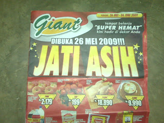 Tanggal 26-Mei-2009 berdiri lagi di Jatiasih sebuah Supermarket raksasa namanya GIANT yang siap menelan korban pedagang kecil. Sangat cepat sekali pertumbuhan di Jatiasih ini.Dulu di Jatiasih cuma ada pasar yang besar yaitu Pasar Rebo…. lama tanpa saingan kemudian muncul NAGA Pasar Swalayan di Jatiasih juga. Lokasinya paling juga sekitar 200m dan tidak sampai setahun muncullah GIANT di lokasi yang lebih strategis yang jaraknya sekitar 500m dari NAGA.